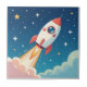 Cute red and white rocket blasting off in space with whimsical stars and clouds.