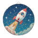 Cute red and white rocket blasting off in space with whimsical stars and clouds.