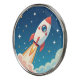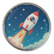 Cute red and white rocket blasting off in space with whimsical stars and clouds.