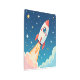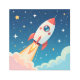 Cute red and white rocket blasting off in space with whimsical stars and clouds.