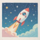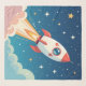 Cute red and white rocket blasting off in space with whimsical stars and clouds.