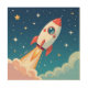 Cute red and white rocket blasting off in space with whimsical stars and clouds.