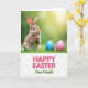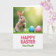 This design shows a small bunny 🐰 sitting upright in thick green grass near the top of a tall, vertical layout, lit by gentle spring sunlight from the upper right. Its mottled brown-and-white fur looks soft and detailed, and its dark eyes seem to linger with a tender, friendly curiosity. The bunny’s front paws are held together as if waiting politely, adding a quiet, affectionate mood to the scene. To the bunny’s right, two decorated eggs rest in the grass—one bright blue and one pale pink—each covered with tiny flower shapes and scattered dots in several colors 🌷. Behind them, the background fades into a smooth blur of fresh greens, like a meadow stretching out of focus. Along the bottom, a wide white band holds the greeting text centered, with the main words in pink and accent words in green, using flowing letterforms. The blue egg sits slightly closer to the bunny than the pink egg, and both are partly tucked into the grass tips.