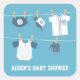Decorate your party favors and door gifts for the baby shower with this baseball themed baby shower sticker! This baseball baby shower design has cute baby items hanging on clothesline for the little one. From a baseball diaper, a hat with star icon, baseball tees and a mitten. Personalise easily with party message. Blue and white colour palette is most suited for baby boy.
