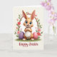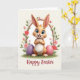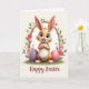 This card shows a friendly, animal-like bunny figure with ginger-brown fur, long expressive ears, and bright blue eyes that seem to meet yours with a tender, welcoming look 🐰. It stands on a rich green patch of grass with its small paws held close to its chest, wearing a simple white bib that adds a sweet, gentle touch. Around the bunny is an arch of spring flowers and leaves, mixing soft pink blossoms, deeper red blooms, small white flowers, and fresh green foliage, like a garden path meant for two. On either side sit two oversized egg shapes, one in calm lavender and the other in soft pink, angled slightly inward as if keeping the bunny company 🐇. The lighting is soft and diffused, bringing out the fluffy texture of the fur and the smooth finish of the eggs without harsh shadows. Along the bottom edge, a short line of text is centered in a dark ink color against the pale background, easy to spot without overpowering the art. Behind everything is a creamy, light-toned backdrop that makes the greens, pinks, and purples stand out, with the floral arch curving neatly above the bunny’s ears.