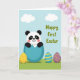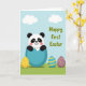 This design shows a soft spring scene with a black-and-white baby animal, bear-like with dark ear patches, peeking up from a teal eggshell with a shy pink blush on its cheeks 🐰. The little creature’s wide eyes and slightly tilted head give it a tender, friendly look, as if it’s greeting someone special just out of frame. A pale blue sky fills the background, with two white clouds drifting near the top for an airy, calm setting. Along the bottom, a bright green strip of ground holds three decorated eggs arranged like a small gift left for a friend 🌷. One egg is yellow with orange spots, another is teal with yellow stripes, and the third is purple with small golden dots. A short phrase appears neatly within the design in green lettering, placed so it doesn’t cover the character and stays easy to read. Soft shadows sit beneath the eggs and the shell, and the teal shell is cracked open with jagged edges around the opening.