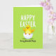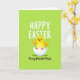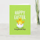 This design shows a chubby yellow chick sitting in a cracked white eggshell at the center, its tiny orange wings slightly spread as if reaching out for a hug 🐰. The chick’s round dark eyes and rosy cheeks give it a sweet, friendly look, like it’s sharing a private joke with someone close. Behind it, a smooth lime-green background fills the whole space, hinting at fresh grass and early spring days 🌷. The lighting is even and soft, keeping the chick’s rounded shape gentle and inviting with no sharp shadows. Across the top, large white lettering stretches in a simple, easy-to-read style to deliver the main holiday greeting. Near the bottom, a smaller line of black flowing lettering adds a more affectionate note, set beneath the chick and above the lower edge. The eggshell pieces are bright white with small jagged cracks, cupping the chick like a little nest against the green backdrop.