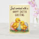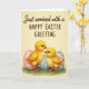 This card shows two small, bright yellow baby birds standing close together on a lush green patch of grass, angled toward each other as if sharing a quiet, friendly secret 🐇. Their fluffy bodies look soft and rounded, with wide dark eyes and tiny orange beaks that almost meet in the middle. Behind them, three decorated egg shapes rest in the greenery, tinted pastel pink, pale blue, and soft gray, each covered with simple stripes and dotted patterns 🌷. The background is a warm creamy tone that gives the whole scene a gentle springtime glow. Near the top, a seasonal greeting is printed in two contrasting styles, with thin flowing letters paired with thicker, heavier letters for emphasis. The text sits centered above the birds and appears in a dark shade that stands out clearly against the light background. Small tufts of grass frame the birds’ feet, and the pastel eggs peek out just behind their shoulders.