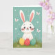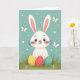This design shows a stylized white bunny sitting in a narrow strip of green grass, its long ears showing soft pink inside and a faint blush on its cheeks 🐰. Its dark, wide eyes and tiny heart-shaped pink nose give it a tender, friendly look, as if it’s quietly sharing a sweet moment with the viewer. Small pink flowers dot the grass around it, adding a gentle spring setting. Near its paws are three decorated eggs—one yellow, one red, and one turquoise—each covered with neat white polka dots for a cheerful contrast. The background is a smooth mint-to-aqua field sprinkled with small floating hearts in white and pale pink, suggesting affection without saying a word 🌷. There is no visible text on the front, leaving the artwork centered and open, with the main figure placed slightly above the lower edge. White butterflies with tiny red accents drift across the upper area, spaced around the hearts against the calm pastel sky.