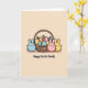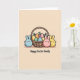 This card shows three round, rabbit-like friends gathered close around a rustic woven basket, creating a cozy little moment of togetherness 🐰. The basket is filled with pastel oval eggs in blues, yellows, greens, and oranges, decorated with polka dots, stripes, and smooth patches that feel carefully chosen for one another. A sky-blue bunny with rosy cheeks stands on the left, angled toward the others as if quietly admiring what they’ve found. On the right, a rose-pink bunny leans in against a lemon-yellow companion, their faces turned toward each other with a tender, friendly closeness 🐇. Sprigs of soft green leaves and a small pink flower peek out between the eggs, adding a gentle springtime touch. The background is creamy beige, and thin black outlines define each shape for a simple, storybook look. Along the bottom, a short greeting appears centered in small, dark lettering beneath the basket. Near the upper area, tiny scattered specks in pale colors float like confetti above the scene.