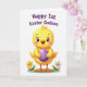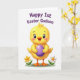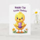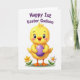 This card features a fluffy yellow baby bird at the center, with wide violet eyes and softly blushed cheeks that give it a sweet, friendly look 🌷. Its tiny orange feet rest on a small green patch, suggesting a fresh spring morning. The little wings curl protectively around a smooth purple egg, like it’s being held close in a gentle, caring hug. A bright white background keeps the scene airy, while two simple flowers sit nearby—one yellow and one white, each with an orange center—adding a calm garden touch 🐰. Soft, diffused lighting creates mild highlights on the bird’s rounded feathers and the egg’s glossy surface. Across the top, curved text in deep purple is placed like a crown above the bird, standing out clearly against the white space. The purple egg sits slightly below center, nestled between the bird’s wings, with the two flowers flanking the scene on either side.