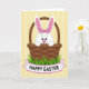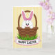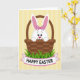 This card features a white bunny with tall, expressive ears peeking out of a warm brown woven basket, its pink inner ears and a pink-and-white striped bow adding a sweet, friendly touch 🐰. The bunny’s wide dark eyes and small curved mouth create a gentle, inviting look, like it’s leaning forward to greet someone it cares about. Centered on the design, the basket sits on a strip of stylized green grass that feels like an early spring lawn. Across the grass is a soft banner with a scalloped pink edge, giving the scene a cozy, affectionate frame. The greeting text sits on the banner in a darker contrasting color for easy reading, while smaller supporting words appear neatly beneath it in a matching tone. Behind everything, a light yellow background with subtle vertical stripes keeps the scene airy and bright, like morning light in spring 🌷. The basket’s woven lines are drawn with simple texture, and the pink scalloped border traces the banner’s edge beneath the bunny’s paws.