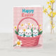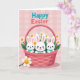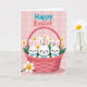 This greeting card features three stylized long-eared creatures nestled together as they peek out of a rustic woven basket, their close spacing and gentle, side-by-side gazes suggesting sweet friendship 🐰. Their fur is bright white with soft pink inner ears and rosy cheeks, and each has round, shining eyes that feel welcoming and attentive. A turquoise collar circles each neck, and one collar includes a small golden accent that helps the trio feel like a little group with its own bond. The basket is shaded in soft rose tones with a visible woven texture, giving the scene a cozy, homey setting. Around the basket rim, daisy-like flowers with white petals and sunny yellow centers mingle with fresh green leaves, creating a natural frame that draws attention to the characters 🐇. Near the top, the words “Happy Easter” sit prominently, with the lettering split between vivid turquoise and soft coral for a lively contrast. Behind everything, a pale pink gingham background pattern fills the space evenly without crowding the main illustration. The flowers cluster most densely along the upper edge of the basket, with petals overlapping the weave and small leaves tucked between blooms.