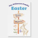This custom event sign features an Easter Egg Hunt theme. An image of a little white bunny sneaking away with an egg is pictured in the bottom. Behind the bunny is a wooden sign that says "Egg Hunt" with arrows pointing in the direction the bunny is coming from. A tiny little bird is perched on the sign. A sample family name is printed at the top which you can personalize to include your own custom event name.