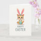 This design shows a stylized cat centered on a pale cream background, drawn in soft tawny oranges and warm browns with gentle stripes in the fur. It wears a spring hare ear headband 🐰, with long pointed ears decorated by small flowers and a few pastel egg shapes tucked along the band. The cat’s wide eyes and long lashes are turned slightly downward toward what it’s holding, giving the scene a tender, caring look like it’s presenting a gift to someone close. In its paws, it cradles a large oval egg filled with ornate swirls and curls in blues, pinks, and yellows, creating the main burst of color. Near the bottom, a short seasonal greeting sits centered in thick, friendly lettering, colored a muted gray-green that stands out softly against the light background 🌷. The spacing leaves plenty of open area around the character, keeping the focus on the gentle pose and the decorated egg. The floral accents on the headband are tiny and pastel, while the egg’s pattern has alternating curved bands and small decorative dots.