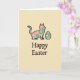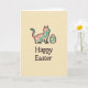 This card shows a stylized cat in profile standing close to a decorated egg, like they’re sharing a quiet moment together 🐰. Both figures are outlined in a soft, dark line that stands out against a warm, creamy beige background. The cat’s coat is filled with small flowers and round motifs in pastel teal, soft rose, and sage green, with little cream accents that make the pattern feel gentle and close. The egg beside it carries the same floral-and-circle pattern, tying them together like a matched pair in a spring setting 🌷. Their positioning—side by side with the cat’s attentive gaze angled toward the egg—suggests a tender, friendly connection without needing any extra scene elements. Centered beneath them, the words “Happy Easter” appear in a classic serif style in a rich brown color. The overall layout leaves plenty of open space around the artwork, keeping the focus on the patterned pair. The cat and egg sit above the brown text, with the repeated floral shapes clearly visible across both surfaces.