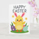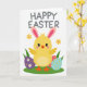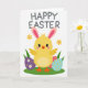 This card shows a bright yellow baby bird with a rounded shape, wide black eyes, pink cheeks, and a small orange beak, giving it a sweet, friendly look 🐰. Long soft pink bunny ears sit on top of its head, and the gentle tilt of its face adds a tender, companionable feel to the scene. The bird stands in a patch of green grass, as if pausing to greet someone close. Around it are three decorated eggs: a deep purple one on the left with small white daisy shapes and scattered gold dots, a light blue one on the right with yellow dots, and a partly seen pink one also dotted in yellow 🐇. The background stays white, with tiny yellow star-like flowers sprinkled around for a light springtime touch. Near the top, a short holiday greeting appears in rounded gray letters, centered above the illustration. Small yellow star-shaped blossoms float in the open white space around the text and above the eggs.