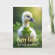 This card features a close-up portrait of a fluffy, pale yellow baby bird, its soft down catching warm light like a gentle halo. The little bird’s dark eyes glance slightly to the right, giving it a shy, friendly look, and its small bill shows a faint pink tint. Behind it, the background fades into a blurred green meadow effect, like sunlit grass out of focus, keeping all attention on the chick 🐰. Bright green three-leaf clovers sit around the bird, including one placed prominently in the foreground as if it’s being offered like a tiny gift between friends 🌷. The lighting stays soft and golden, adding a cozy, springtime glow to the feathers and the surrounding greens. A short seasonal greeting is printed along the bottom edge in a light, gentle color, centered and easy to read without crowding the image. The clover in front shows crisp leaf edges with a slightly glossy sheen against the soft, fuzzy texture of the chick.