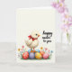 This card features a pale yellow baby bird with fluffy down, a tiny orange beak, and bright blue eyes, wearing a red ribbon that reads like a sweet little gift from a close friend. It stands on a cluster of glossy Easter eggs in the lower middle, and the careful way it leans forward gives the scene a gentle, affectionate energy 🐰. The eggs are decorated with polka dots and small flower motifs in soft pastel blues, purples, reds, oranges, and yellows, adding variety without feeling busy. Above the illustration, a wide area of creamy off-white space keeps the layout airy and draws attention downward. On the right side, a short Easter greeting appears in a flowing cursive style, set in a medium-dark gray that contrasts softly against the background 🌷. Under the eggs, green blades of grass peek out with a few tiny wildflowers scattered through them like little notes of color. Soft, diffused lighting creates subtle shading on the eggs and a faint shadow beneath the bird. The greeting sits to the right of the bird, aligned around mid-height, with the red ribbon and pastel eggs clustered below it.