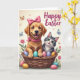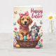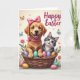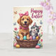This card features a springtime scene with a golden puppy wearing a bright pink bow and matching collar, smiling wide with shiny eyes as it leans close to a striped kitten with green eyes and a small, content grin 🐰. The two little animals sit snugly together inside a rustic woven basket, their faces angled toward each other in a friendly, affectionate way. The basket is filled with pastel oval treats in soft yellows, blues, pinks, and greens, each decorated with tiny patterns that add detail without crowding the scene. Gentle light washes over the illustration, making the fur look soft and the basket weave stand out. Around the basket, small butterflies drift near pink and purple blossoms, and a few floating heart shapes add a sweet, close-knit mood 🌷. In the upper right area, the words “Happy Easter” appear in magenta, set on a slight diagonal so it feels airy and easy to spot. Behind everything, the background stays light and springy with scattered petals, faint hearts, and a couple of butterflies near the top edge.
