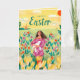 Cute spring woman in tulip field Easter Holiday Card