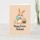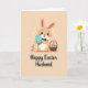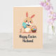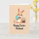 This card shows a sweet, human-like bunny centered on a muted peach background sprinkled with tiny white shapes, setting a gentle spring scene 🌷. The bunny’s large dark eyes and rosy cheeks give it a tender, friendly look, with long ears that fade to a soft blush at the tips 🐰. A neat navy bow tie adds a dressed-up touch as the bunny holds a turquoise oval decorated with fine white patterning close to its chest, like a small gift meant for someone special. To the left, a small cluster of red and orange blossoms leans inward, as if joining the bunny in the moment. On the right, a rustic basket sits full of colorful patterned egg shapes, adding extra detail and warmth to the setting. Near the bottom, a short message is placed in dark lettering, centered beneath the illustration and easy to spot against the light background. The overall colors stay soft and pastel, with gentle shading that keeps the scene calm and affectionate. The turquoise oval has delicate white lines and dots arranged in tidy bands across its surface.
