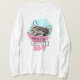 long sleeve woman t-shirt for a funny and cute look with painted spying kitten in ink and watercolor using feminine pink and blue colors in front and meow. typography.