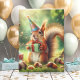 Adorable squirrel in birthday hat holding a gift personalized birthday card.