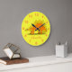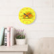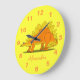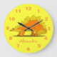 This fun and whimsical custom wall clock is perfect for dinosaur lovers or a kids bedroom. It has a cute cartoon orange and yellow Stegosaurus dinosaur on a bright and cheery yellow background. The clock has orange numbers.