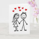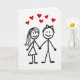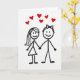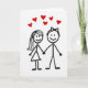 This card shows two simple stick figures drawn in black on a white background, smiling as they hold hands. The girl has long hair and a small skirt, and the boy has spiky hair with a little bow at his neck. Above their heads, five red hearts float in a gentle curve, adding a warm pop of color ❤️. The faces are open and happy, and the hand-holding makes the scene feel close and caring. There isn’t any text on the front, so the picture does all the talking in a quiet, direct way. It feels meaningful to give because it keeps the focus on being together, whether that’s romance or close friendship 🥰. The simple drawing also leaves space for your own message inside, so it can match your relationship. Hope it helps you share your Valentine’s Day sentiments.
