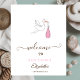 A cute stork illustration pregnancy announcement saying a baby is on the way.