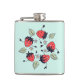 Cute strawberries flask with a vector illustration depicting 5 happy smiling strawberry characters dancing in a circle surrounded by leaves and flowers of their own kind. Fun design with a spring spirit for a person who loves these yummy fruits.