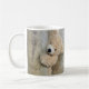 A mug with a darling photograph of a cute stuffed bear, standing by a rustic wooden wall / backdrop.