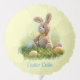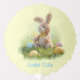 A cute brown stuffed Easter bunny wearing a yellow bow sits in green grass surrounded by colorful, decorated Easter eggs.
