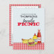 This fun and whimsical design features a modern minimalist picnic family reunion, fun summer cookout trendy colorful, barbeque barbecue bbq cute retro, hamburger cheeseburger hotdog vintage, hotdog mustard ketchup cartoon, trendy script calligraphy food gingham, sausage outdoor picnic chef grill, simple minimalist illustration, gingham red tablecloth, potluck outdoor backyard, budget postcard