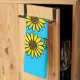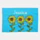 Cute, modern tea towel featuring three sunflowers. You can even customize the background to their favourite color. Designed by Thisisnotme©
