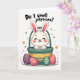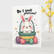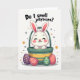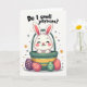 This card shows a fluffy white bunny 🐰 with tall upright ears and soft pink inner details peeking out of an emerald-green basket trimmed with warm golden-yellow bands. The bunny’s eyes are closed, its cheeks are rosy, and its small curved smile feels like a shy, affectionate secret shared with someone close. Centered above the illustration, a rounded black question-style message sits near the top, standing out clearly against the white background. Beneath the basket, three egg-shaped treats rest on a small patch of green ground, arranged like little gifts set out for a friend. One egg is deep plum with bright yellow dots, another is coral-red with thin white stripes and tiny gold specks, and the third is green with white bands and small orange accents. Around the scene, scattered gold starbursts and a few muted green circles add a soft sparkle 🌷 without crowding the main image. The basket’s emerald body and golden bands sit above the trio of decorated eggs, with the bunny’s ears reaching upward toward the text.