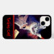 This sweet phone case is adorned with an adorable tabby cat sitting in rafters photograph that has been digitally altered giving it a glowing appearance. Fill in the template field with a name, initials, remove the text or click customize to select a font style, size, and color you prefer.