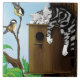 High in the branches, a silver tabby kitten has claimed the coziest perch in the forest. Curled peacefully atop a rustic wooden birdhouse, one paw dangling in complete trust, this sleepy little dreamer rests while two curious songbirds watch from nearby twigs. The gentle woodland setting, soft leaves, and warm wood tones create a playful yet serene moment where feline and feather share the same tree. Perfect for cat lovers, bird enthusiasts, and anyone who adores charming nature scenes, this illustration brings warmth and quiet whimsy.