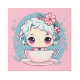 An adorable kawaii style doll sitting in a tea cup. Perfect design for kids and adults on many trendy products! Customize your background color or add text!