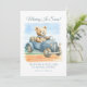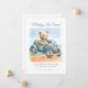 Celebrate your good news with a cute baby boy pregnancy announcement in whimsical watercolor. A storybook teddy cruises a vintage blue roadster beneath the playful headline “Moving In Soon.” Cozy and cheerful, this design is easy to personalize with your names and due month for a warm, joyful reveal to family and friends. Available in print, as a digital download, or both!