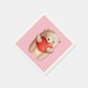 Paper napkins with a cute watercolor illustration. A brown teddy bear carrying a big red heart. Light yellow polka dots on a pink background.