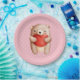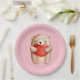 Paper plates with a cute watercolor illustration. A brown teddy bear carrying a big red heart. Light yellow polka dots on a pink background.