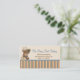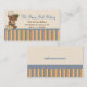 Whimsical bakery business card done in pale tan, at the top, and muted blue, green, brown, and golden yellow stripes, on the bottom of the card. Sweet graphics of a brown teddy bear chef, holding a flour bowl and rolling pin decorates the left side of the card. Text in blue and brown is fully customizable to suit your business needs.