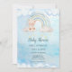 Cute baby shower invitations for baby boy featuring an adorable teddy bear, rainbow and clouds.