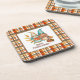 Cute Thanksgiving-themed coaster set features a pair of gnomes holding pumpkin and pie with Autumn colored plaid background and "Happy Thanksgiving" text.