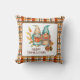 Cute Thanksgiving themed throw pillow features a pair of gnomes holding pumpkin and pie with Autumn colored plaid background