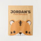 This design features cute tiger cartoon illustration with personalized name in brown modern sans serif font style on pastel orange background.