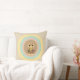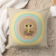 Fashion throw pillow with a cute tiger cat emerging from multicolored pastel circles on beige background.