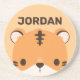 This design features cute tiger cartoon illustration with personalized name in brown modern sans serif font style on pastel orange background.